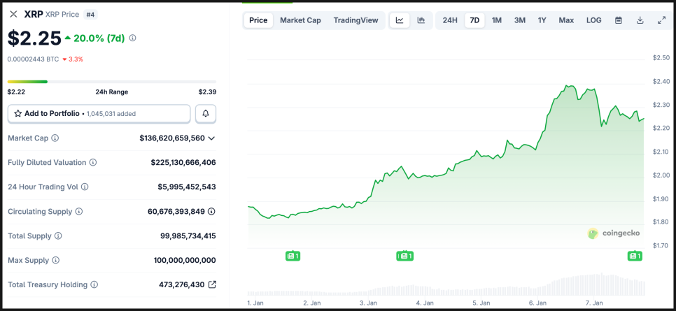 실제로 최근 일주일 동안 XRP 가격은 약 20% 급등했는데요. 같은 기간 비트코인은 약 4%, 이더리움은 약 9% 상승하는 데 그쳤습니다. CNBC 진행자 브라이언 설리번은 방송에서 “올해 가장 핫한 디지털 자산”이라고 표현할 정도로 XRP의 초반 성과를 높게 평가했습니다.