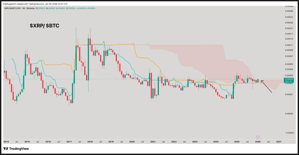 흥미로운 부분은 XRP와 비트코인의 상대 강도를 보는 시각입니다. 일부 차트 분석가들은 XRP/BTC 비율 차트에서 매우 드문 신호가 나오고 있다고 지적합니다. 월봉 기준으로 이치모쿠 구름대를 상향 돌파할 가능성이 거론되고 있는데, 이 패턴이 마지막으로 나타났던 게 2018년이라는 겁니다.