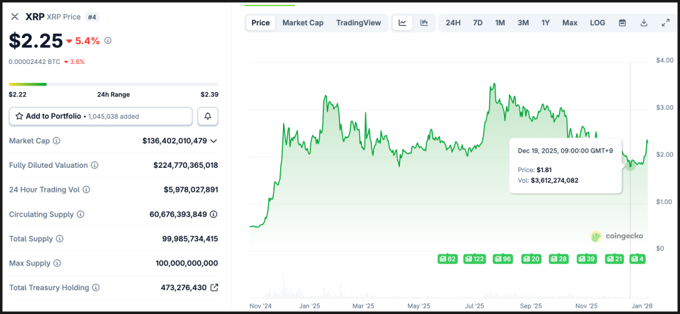엑스알피 코인은 올해 최고 30% 이상 오르면서 비트코인, 이더리움, 솔라나 등 주요 코인보다 훨씬 많이 올랐습니다. 그러나 오늘 XRP 가격은 단기적으로 꽤 흔들리고 있는데요. 1월 7일 기준으로 XRP는 2.4달러에서 2.25달러까지 내려오면서, 시장에서 중요하게 보던 2.32달러 지지선을 이탈했습니다. 기술적으로는 하락 추세 채널 안에서 움직임이 이어지고 있는 상황입니다.