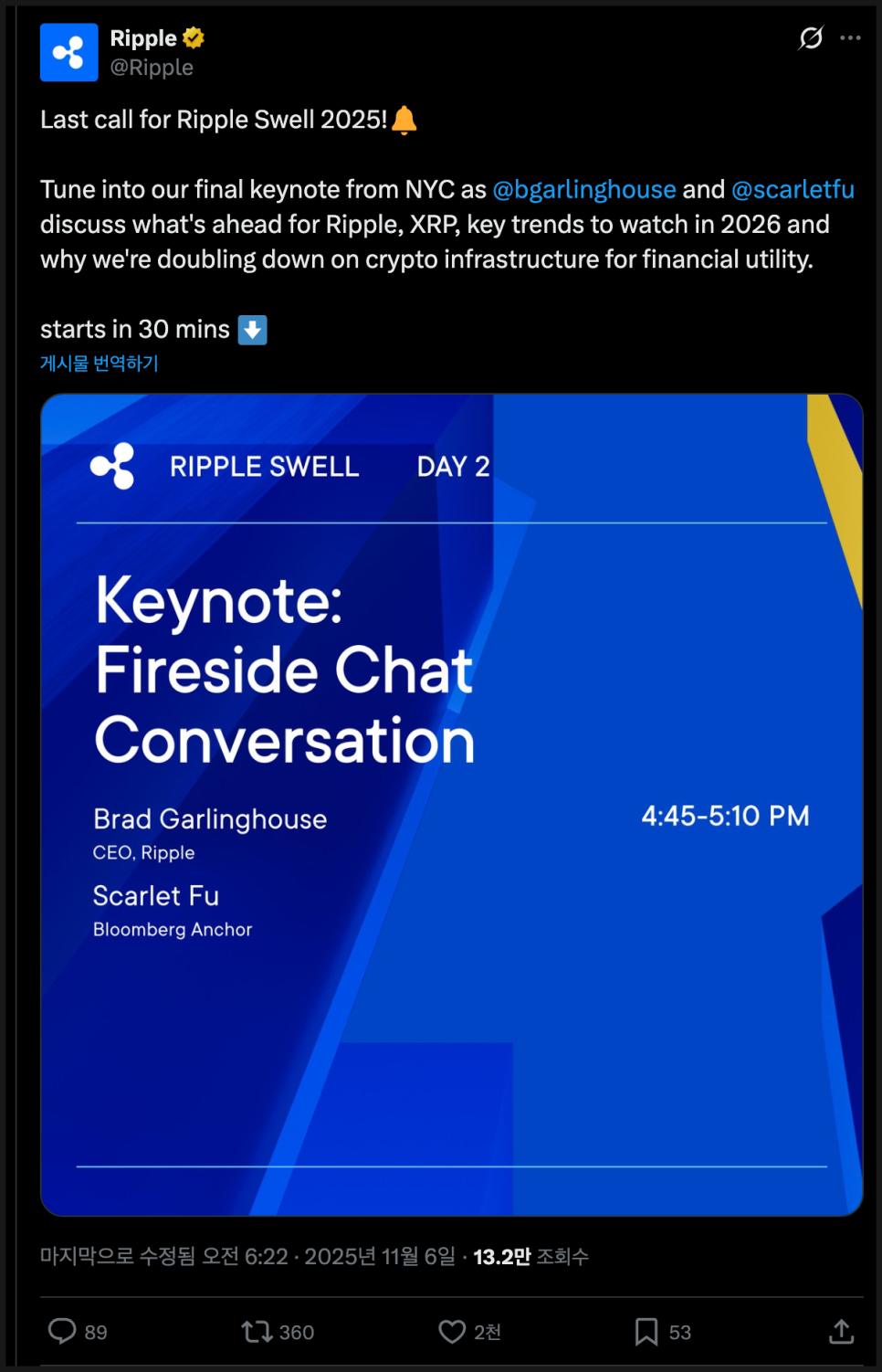 한편 리플 CEO 브래드 갈링하우스는 Swell 2025 콘퍼런스에서 “2026년에도 추가적인 딜이 이어질 수 있다”고 언급했습니다. 그는 마스터카드(Mastercard), 제미니(Gemini) 같은 기업들과의 협력이 기관 대상 상품, 특히 프라임 브로커리지 영역 확장에 도움이 되고 있다고 설명했습니다.