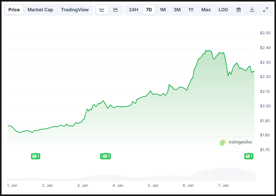 다만 이 하락 과정이 단순한 약세 흐름이라기보다는, 강한 매도 압력이 한 번에 쏟아진 뒤 빠르게 흡수된 형태였다는 점이 눈에 띕니다. 1월 6일 현지 시간 오후, 거래량이 평소보다 40% 이상 급증하면서 가격이 2.21달러까지 급락했는데요. 이 구간에서 추가 하락 없이 매수세가 바로 받아주면서 가격이 안정됐습니다. 흔히 말하는 ‘강제 청산성 매도’ 또는 ‘물량 털기’에 가까운 움직임이었죠.