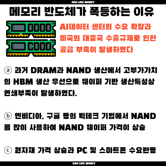 인공지능으로 발생한 메모리 반도체 품귀현상은 26년은 더 심해질 것이다. 공급자 독재까지 예상되는 한 해로 보이는데 특히, NAND와 DRAM이 부족하여 이로 인해 SSD와 RAM가격이 급등하였다. 낸드와 DRAM을 생산하는 삼성전자, SK하이닉스, 마이크론 등 주요 메모리 반도체 회사들은 아예 기존 아이템에서 벗어나 HBM 중심으로 생산하고 있다. HBM은 AI용 고대역폭 메모리로 기존의 DRAM이나 낸드보다 훨씬 빠르고 정교하다.