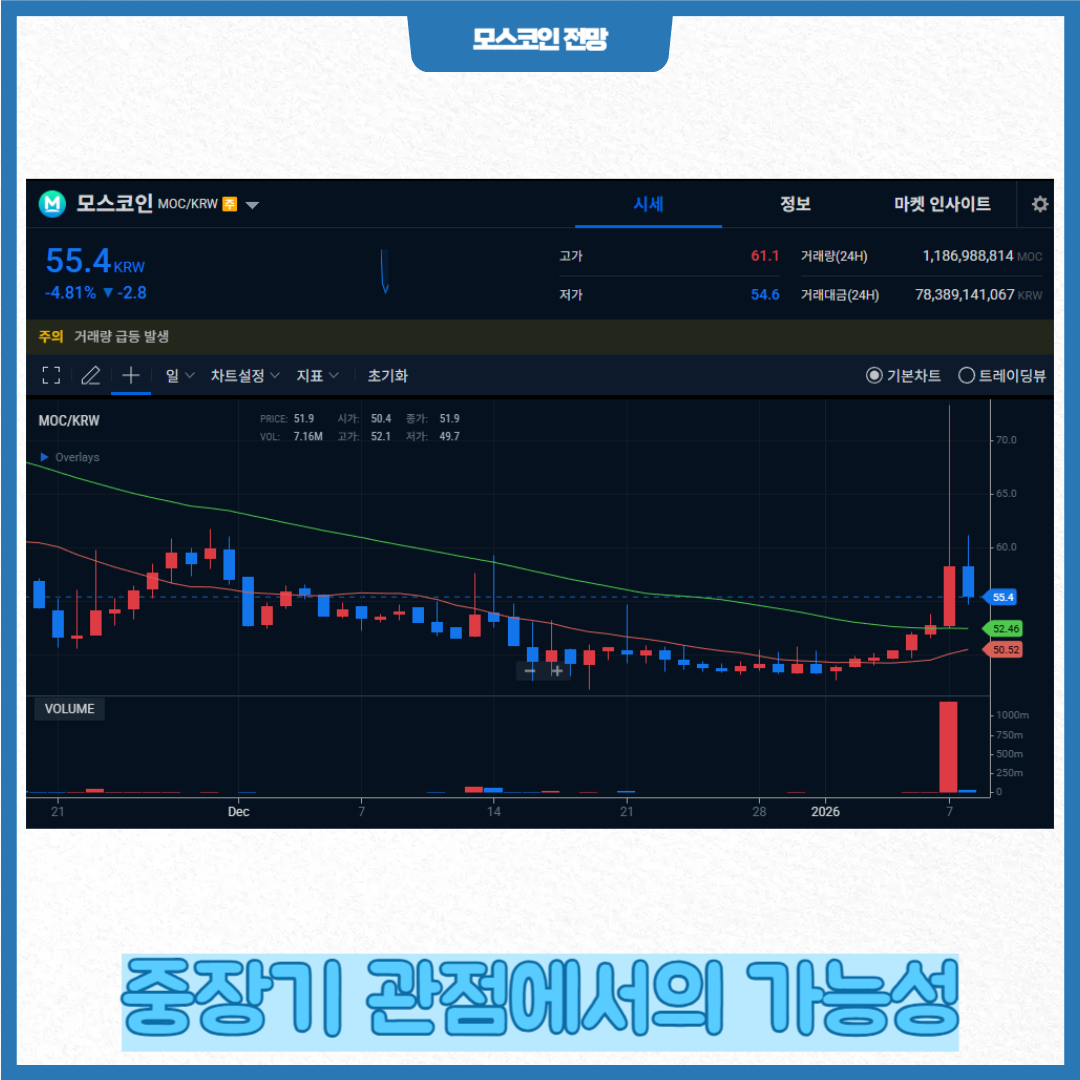 중장기적으로는 모스코인이 추구하는 플랫폼 모델이 실제로 자리 잡을 수 있는지가 가장 중요한 판단 기준이 됩니다. 단순한 아이디어에 그치지 않고, 사용자가 체감할 수 있는 서비스로 이어질 경우 가치 재평가 가능성도 열려 있습니다.