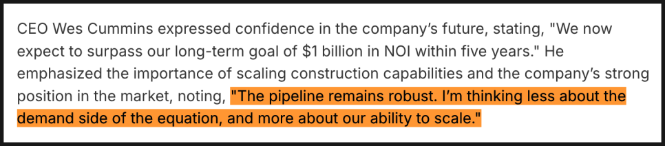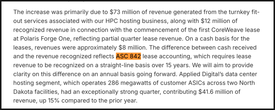 한편 회사 측은 이번 분기부터 실제로 임대가 시작됐는데도 재무제표상 임대 매출이 생각보다 작아 보였던 이유를 설명했는데요. 이는 ASC 842라는 리스 회계 기준 때문이라고 합니다. 쉽게 말해 15년짜리 임대 계약을 맺으면, 실제로는 초기에 현금이 더 빠르게 들어와도 회계상 매출은 15년에 걸쳐 동일한 속도로 나눠서 인식해야 합니다. 그래서 지금은 현금 흐름에 비해 장부상 매출과 이익이 작아 보이는 구간에 있습니다. 회사도 이 부분이 투자자들에게 혼란을 줄 수 있다는 점을 인지하고, 앞으로는 현금 기준과 회계 기준의 차이를 더 명확히 설명하겠다고 밝혔습니다.