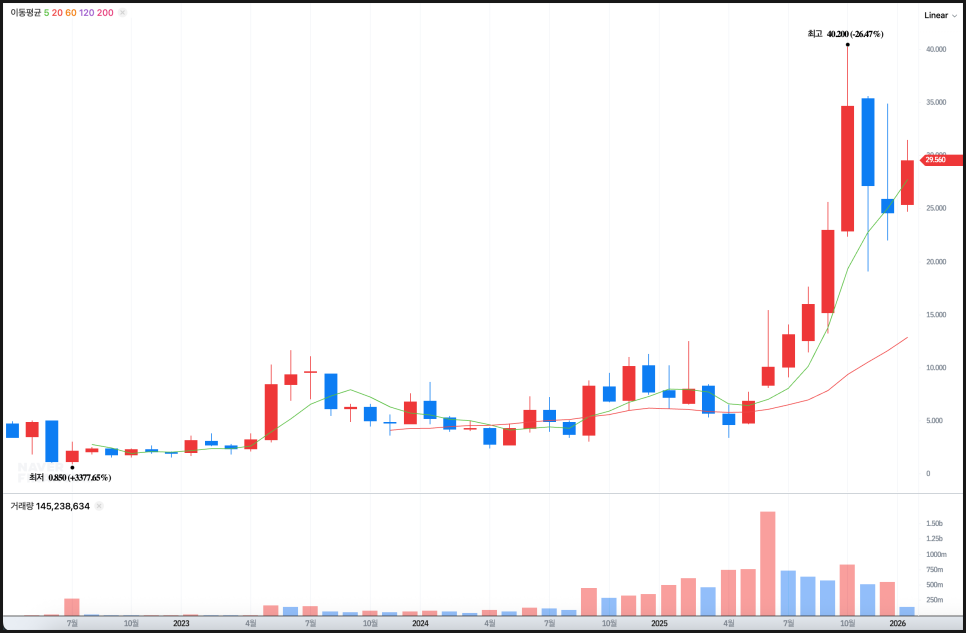 주봉에서는 상승 추세가 한 번 꺾였다가 다시 재정렬되는 과정이 확인됩니다. 급등 구간 이후 주가는 5주선과 20주선 사이에서 여러 차례 흔들렸습니다. 다만 이 과정에서 거래량이 급격히 터지며 던지는 모습보다는, 일정 수준에서 매수와 매도가 반복되는 모습이 더 많이 관찰됩니다. 장기 자금이 급하게 이탈하고 있다기보다는, 단기 과열을 식히는 과정에 가깝다는 신호로 볼 수 있습니다.