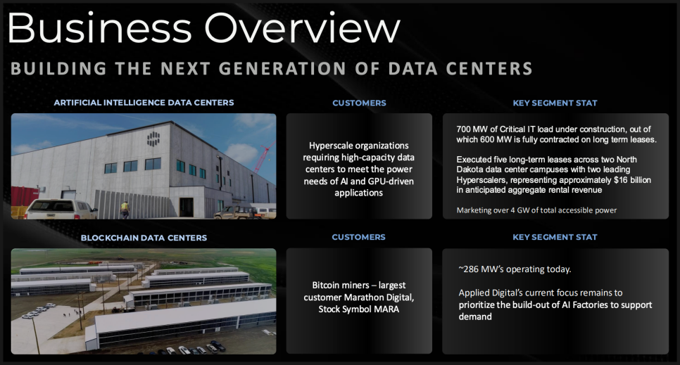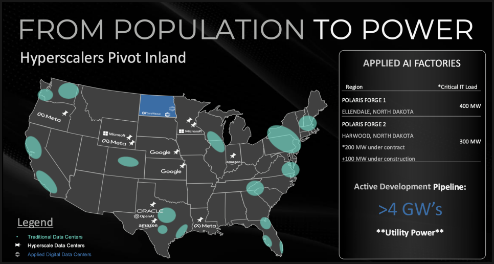 어플라이드 디지털은 AI 인프라 기업입니다. 쉽게 말해 인공지능과 고성능 연산 작업을 위해 설계된 초대형 데이터센터를 건설하고 운영하는 회사입니다. AI 인프라는 막대한 전력을 안정적으로 공급할 수 있어야 하고, 고열을 발생시키는 GPU를 식히기 위한 고급 냉각 시스템이 필요하며, 수천 개의 GPU를 24시간 가동하는 고객을 감당할 수 있는 구조여야 하죠. 이 회사는 과거 암호화폐 채굴 중심의 사업에서 벗어나, 현재는 AI 데이터센터 수요에 집중하는 방향으로 사업을 재정비해 왔습니다. 특히 전력 수급과 기후 조건에서 경쟁력이 있는 지역을 중심으로 전략적 거점을 구축해 왔습니다.