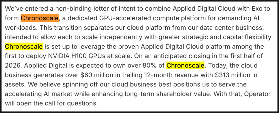어플라이드 디지털 클라우드는 현재 연간 기준 6천만 달러 이상의 매출을 내고 있고, 3억 달러가 넘는 자산을 보유하고 있습니다. 엔비디아(NVIDIA)의 H100 GPU를 대규모로 가장 먼저 도입한 플랫폼 중 하나이기도 합니다. 이를 크로노스케일(Chronoscale)이라는 별도 법인으로 분리하되, 어플라이드 디지털은 지분의 80퍼센트 이상을 유지할 계획입니다. 사업을 축소하거나 정리하는 것이 아니라, 각 사업을 더 명확하게 성장시키기 위한 구조적 선택에 가깝습니다.