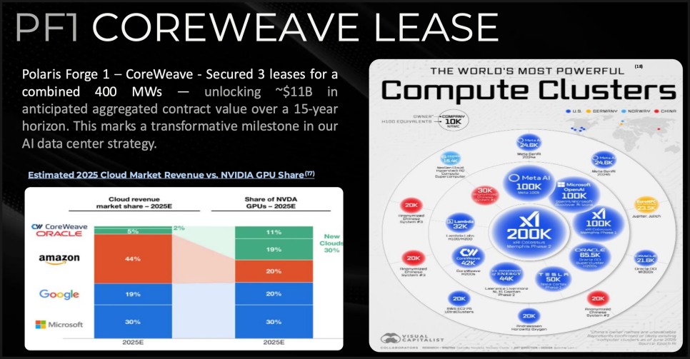 한편 미래 매출의 확정성과 규모도 눈여겨 봐야 하는데요. 회사 측은 이미 계약이 체결된 물량만으로 매우 구체적인 수치를 제시했습니다. 노스다코타에 위치한 폴라리스 포지 원(Polaris Forge One)과 폴라리스 포지 투(Polaris Forge Two) 두 캠퍼스를 합치면 총 600메가와트 규모의 하이퍼스케일 데이터센터 용량이 장기 임대 계약으로 묶여 있습니다. 이 계약들이 향후 약 15년 동안 만들어낼 것으로 예상되는 누적 임대 매출은 약 160억 달러에 달합니다.
