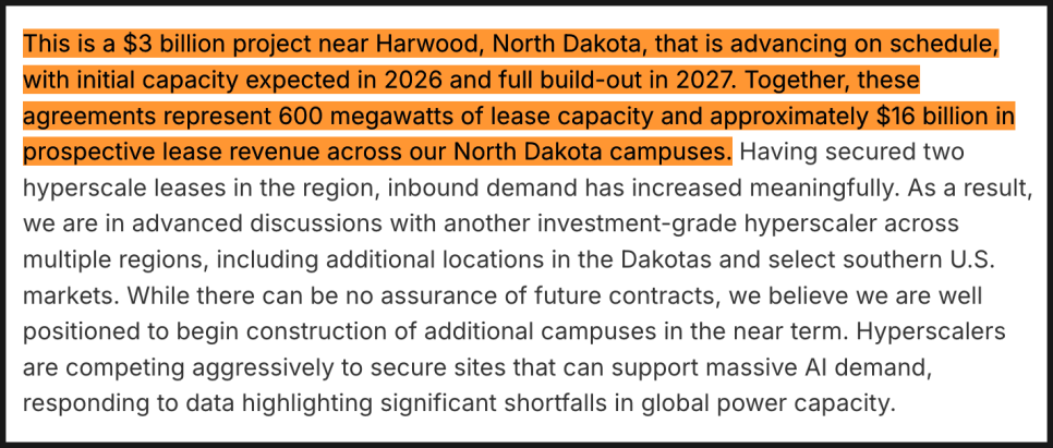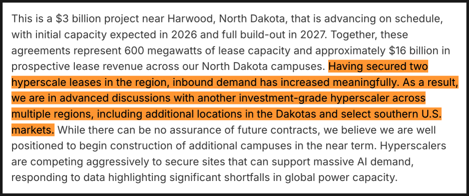 수요의 질도 눈여겨볼 부분입니다. 회사는 이미 두 개의 하이퍼스케일러와 계약을 체결한 이후, 추가적인 문의와 협상이 눈에 띄게 늘었다고 밝혔습니다. 현재는 노스다코타 추가 부지뿐 아니라 미국 남부 지역까지 포함해 또 다른 투자등급 하이퍼스케일러와 심도 있는 논의를 진행 중이라고 했습니다. 기존 캠퍼스들이 일종의 레퍼런스 역할을 하면서 후속 수요를 끌어들이고 있다는 의미로 해석할 수 있습니다.