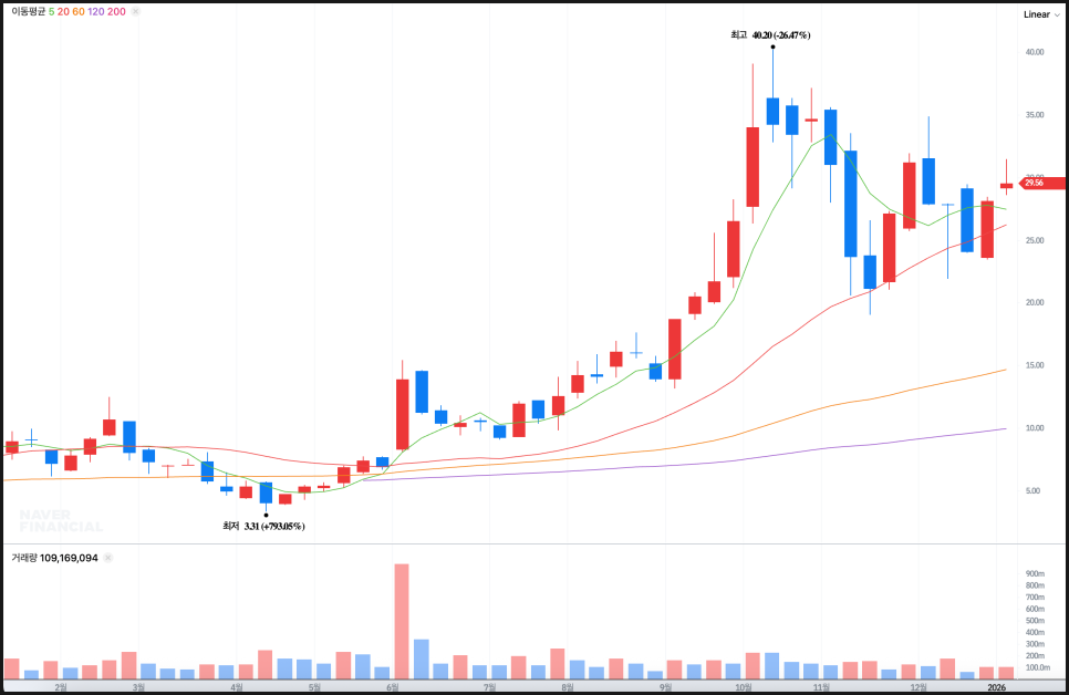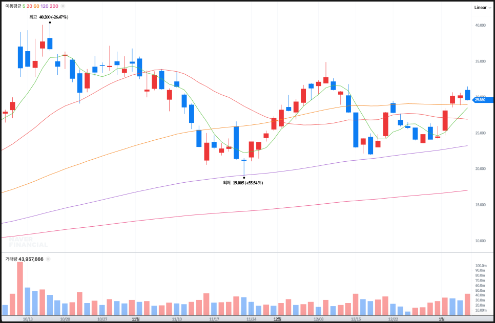 일봉을 보면 최근 몇 달간 주가가 상당히 빠르게 움직였다는 게 보입니다. 급등 이후 급락, 그리고 다시 반등과 눌림이 반복되면서 방향성을 찾는 과정이 이어지고 있습니다.11월 말부터 20일선과 60일선을 중심으로 움직이고 있고, 120일선은 중기적인 기준선으로 작용하는 모습입니다. 전고점인 35 달러를 뚫어주면서 5일선이 60일선을 위로 크로스해준다면 상승세가 강해질 수도 있어 보입니다.