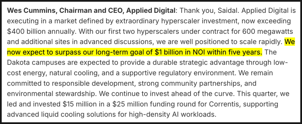 경영진이 이번 컨퍼런스콜에서 가장 강하게 던진 메시지는 장기 수익 목표였습니다. 회사는 향후 5년 이내에 순영업이익, 즉 NOI 기준으로 10억 달러를 넘어설 것으로 기대한다고 밝혔습니다. NOI는 부동산이나 인프라 자산을 평가할 때 자주 쓰이는 지표로, 영업을 통해 실제로 얼마나 안정적인 현금 수익을 창출하는지를 보여줍니다. 이 지표를 전면에 내세운다는 것 자체가, 어플라이드 디지털이 스스로를 단기 성장 스토리보다 장기 인프라 자산으로 포지셔닝하고 있다는 신호입니다.