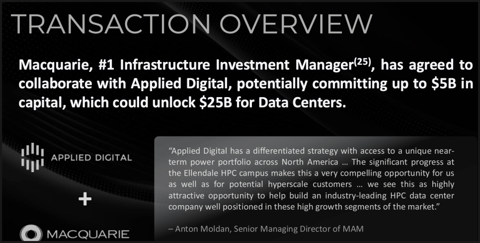 한편 자본 구조 역시 탄탄한 편입니다. 어플라이드 디지털은 무작정 증자를 하거나 단기 차입에 의존해 데이터센터를 짓고 있지 않습니다. 기본적인 구조는 이렇습니다. 먼저 맥쿼리 장비 금융(Macquarie Equipment Capital)의 개발 대출을 통해 초기 건설 자금을 조달합니다. 이후 투자등급 하이퍼스케일러와 임대 계약이 체결되면, 맥쿼리 자산운용(Macquarie Asset Management)이 제공하는 최대 50억 달러 규모의 우선주 투자 구조로 넘어갑니다. 이 구조를 통해 현재까지 이미 약 9억 달러가 집행됐습니다.