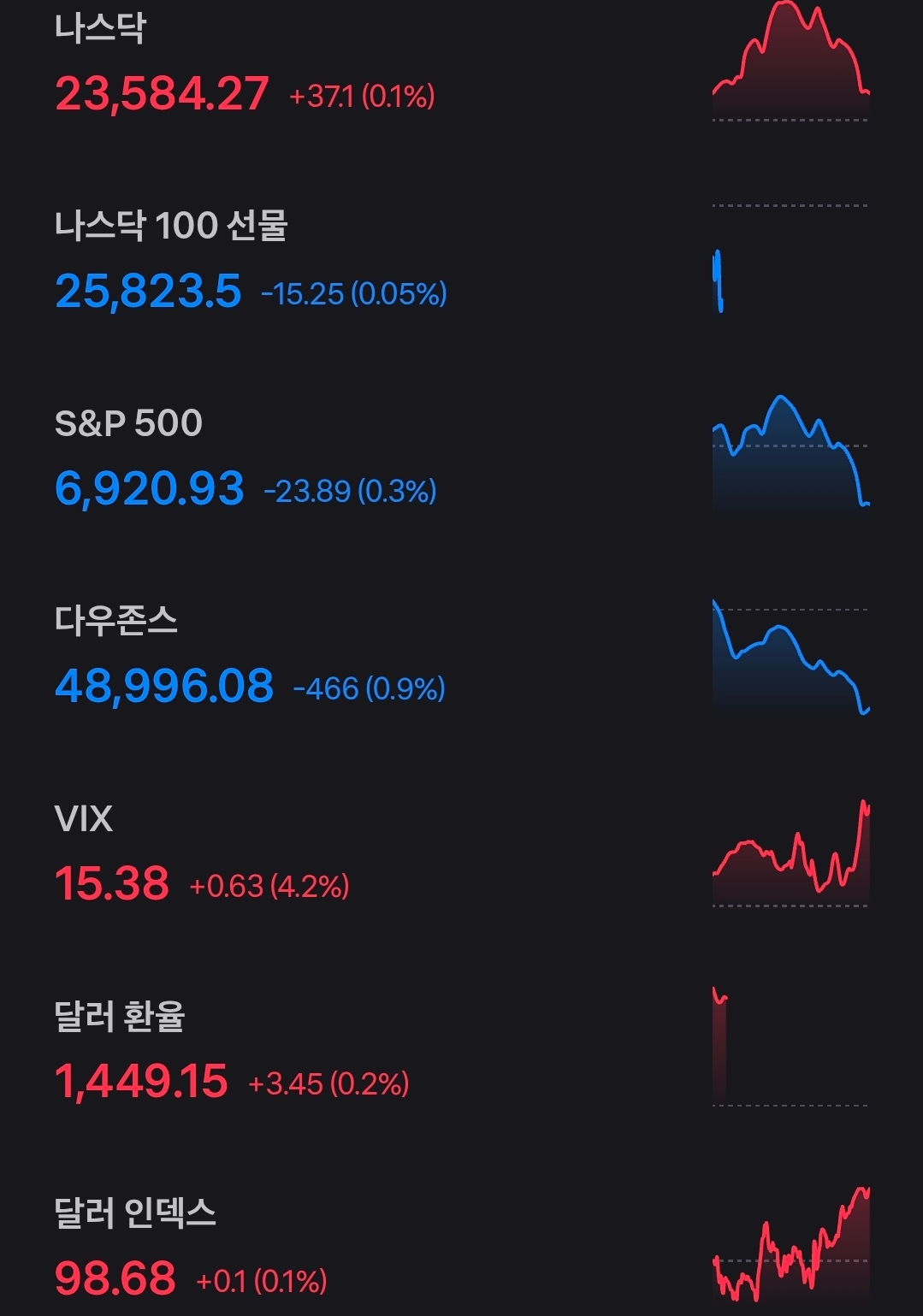나스닥은 23,584.27로 소폭 상승했지만 S&P 500과 다우는 각각 6,920.93과 48,996.08로 하락하면서 시장 내부의 결이 갈렸습니다. 변동성 지표인 VIX가 15.38로 올라온 점은 추세적 공포라기보다 경계심이 다시 올라오는 구간으로 해석됩니다. 달러 인덱스가 98.68로 강세를 유지하고 달러 환율이 1,449.15까지 오른 흐름까지 겹치면 글로벌 자금 흐름은 공격적 확장보다 선별과 방어가 동시에 진행되는 국면에 가깝습니다. 공포탐욕지수도 47 수준으로 중립권에 머물러 방향을 단정하기보다 데이터와 헤드라인에 따라 단기 흔들림이 커질 수 있는 상태로 보입니다.