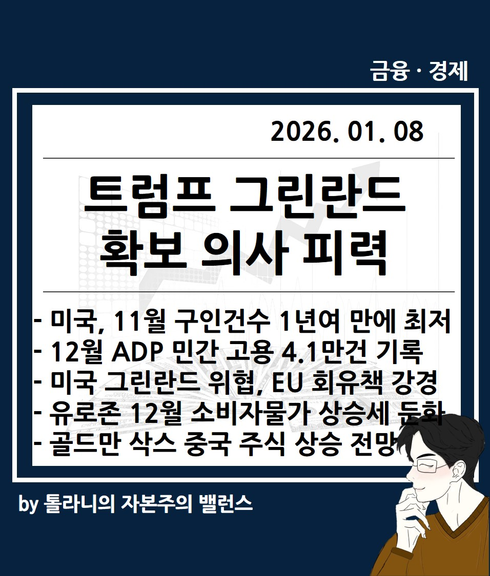 이에 ‘미국 12월 민간고용 현황, 트럼프 그린란드 확보 의사 피력 등 뉴욕 증시는 주요 국가 경제 및 금융 동향’ 관련하여 국제금융센터 보고서를 통해 좀 더 자세히 알아보도록 하겠습니다.