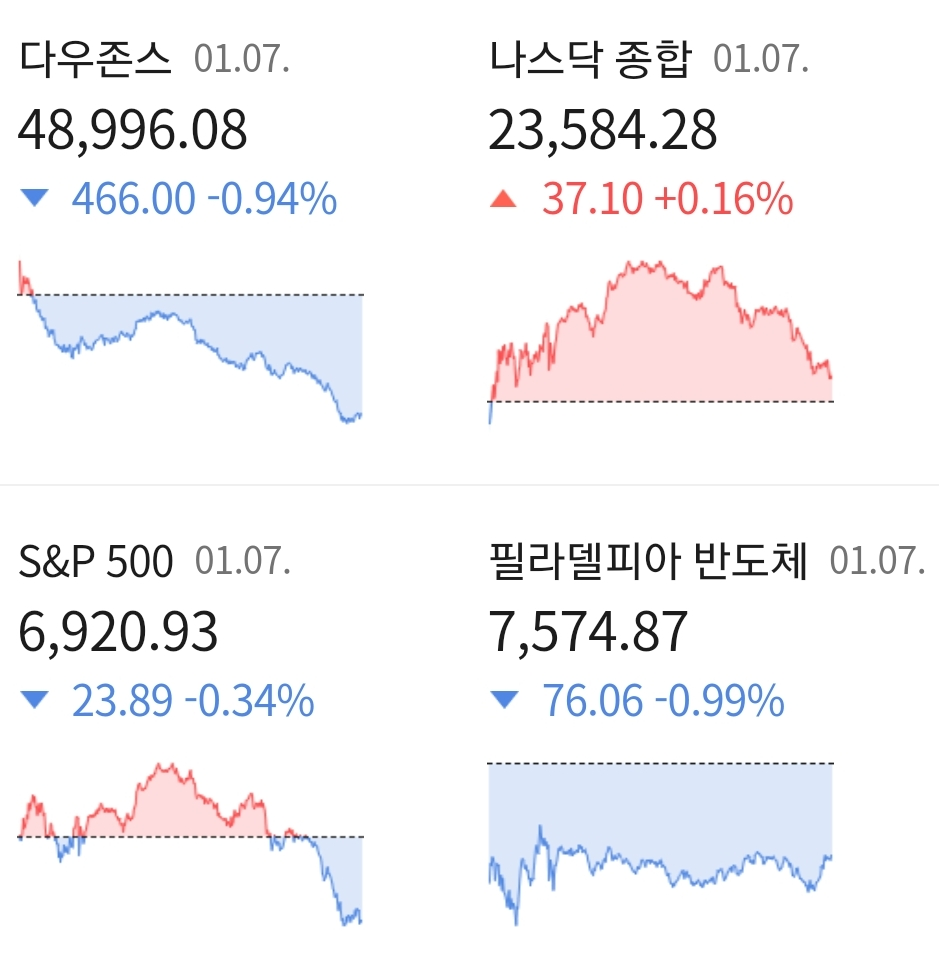 다우지수는 전일대비 0.94% 하락한 48,996.08에 마감하였으며, 대형주 중심의 S&P500지수는 0.34% 떨어진 6,920.93에 거래를 마쳤습니다. 반면 기술주 중심의 나스닥지수는 0.16% 상승한 23,584.27에 거래를 마치며 장을 마감하였습니다.
