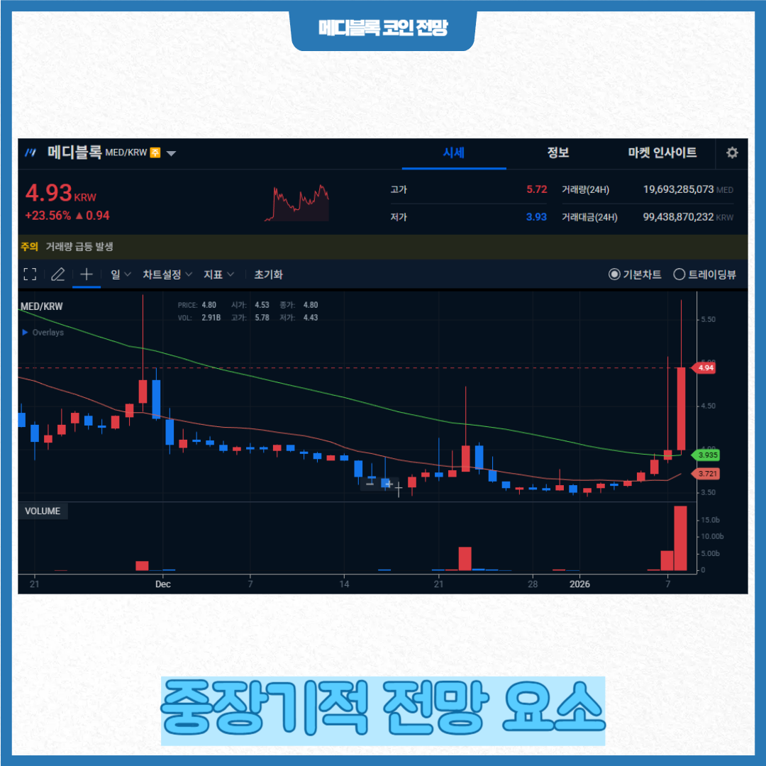 장기적인 관점에서는 몇 가지 긍정적인 시그널도 존재합니다. 일부 시장 자료에서는 프로젝트가 지속적으로 기술적 업데이트 및 생태계 확장을 추진하고 있다는 점 때문에 중장기적으로 수요가 확대될 가능성도 언급됩니다. 특히 의료 분야에서 블록체인 기반 데이터 공유 시스템의 필요성이 커질 경우 메디블록의 플랫폼 활용도는 증가할 수 있습니다.