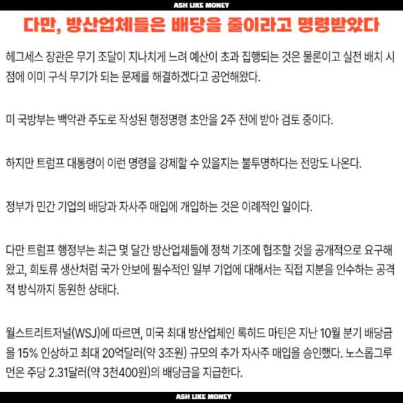 글로벌 지정학적 긴장과 각국의 군사적 개입이 강해지면 강해질수록 각 나라들은 군사훈련과 무기 기술 개발에 더 열 올릴 것이고 방산업체는 더욱 호황을 누릴 것으로 보인다. 최근 노스롭그루만의 실적에선 매출은 예상 하회였지만, EPS(주당순이익)가 10% 증가하고 현금흐름이 개선된 것을 보여주었다. 주요 증권사들도 목표주가를 상향하며 긍정적인 전망을 제시했다. 이는 미국 방산 예산이 확장되고 글로벌 군비 수요 증가에 따른 것이고 한국의 한화그룹과 글로벌 방산 네트워크 강화 역시 한국과 미국 방산업체에 청사진을 그리고 있다.