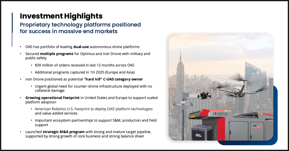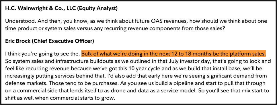 OAS 매출 구조에 대한 질문도 핵심이었습니다. 향후 매출이 일회성 장비 판매인지, 아니면 반복 수익 구조로 갈 수 있는지에 대해 CEO는 향후 12~18개월 동안은 시스템 판매와 인프라 구축이 매출의 대부분을 차지할 가능성이 높다고 했습니다. 다만 이 시스템들은 10년 단위의 장기 운용 주기를 전제로 깔리기 때문에, 시간이 갈수록 유지보수, 서비스, 데이터 기반 서비스가 자연스럽게 얹히는 구조가 된다고 설명했습니다. 방산 고객 중심의 초기 시장에서는 구매 형태가 많지만, 상업 시장이 확대될수록 ‘드론 및 데이터 서비스형 모델’, 즉 구독형·서비스형 매출 비중이 점차 커질 수 있다는 점도 분명히 했습니다.