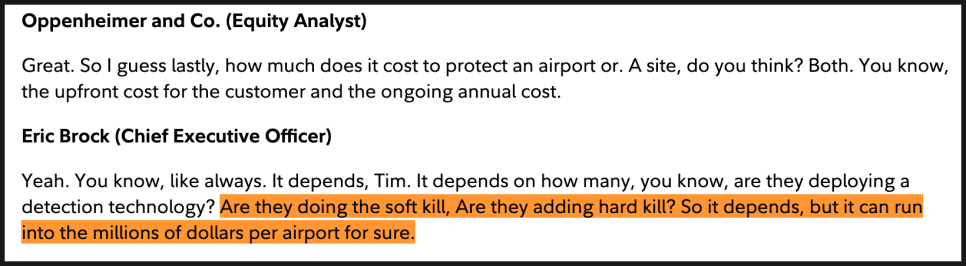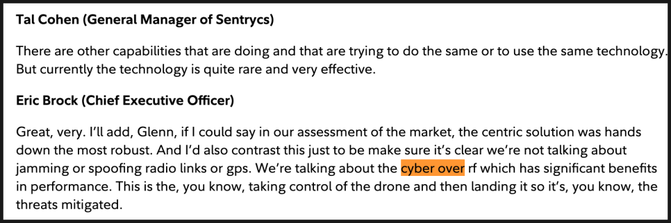센트릭스 인수 관련 설명도 이번 어닝 콜의 핵심 중 하나였습니다. 센트릭스는 전파를 무작위로 방해하는 방식이 아니라, 드론과 조종기 사이의 통신 프로토콜을 직접 장악해 드론을 안전하게 착륙시키는 기술을 보유하고 있습니다. 이미 25개국 이상에서 200건 넘는 실전 배치를 경험했고, 매출 성장률은 연평균 세 자릿수, 매출총이익률은 70% 후반대에 이르는 고수익 구조를 갖고 있습니다. 경영진은 이 기술이 민간 인프라, 공항, 도시 환경에서도 규제 친화적으로 활용 가능하다는 점을 반복해서 강조했습니다.