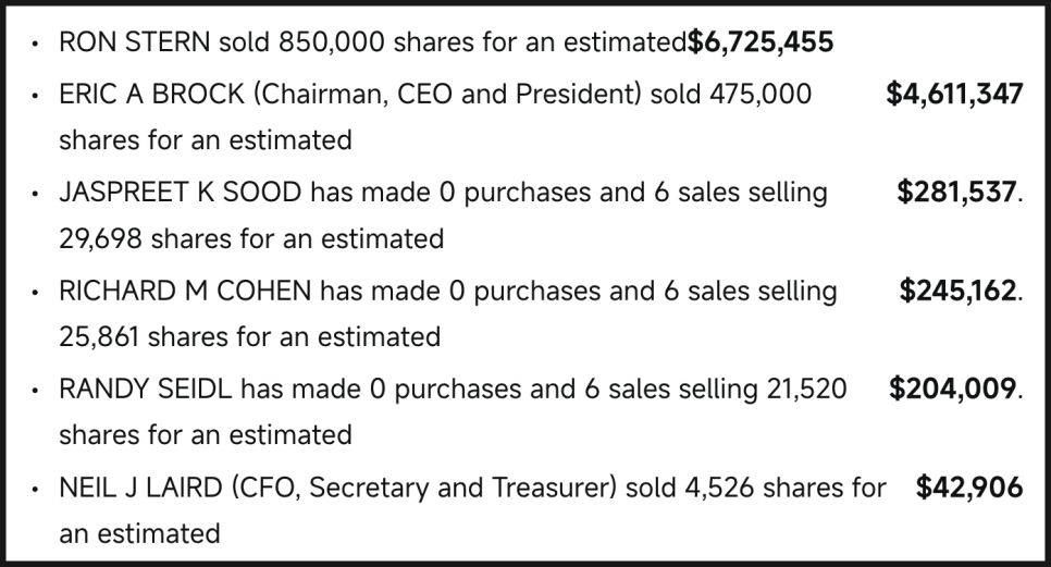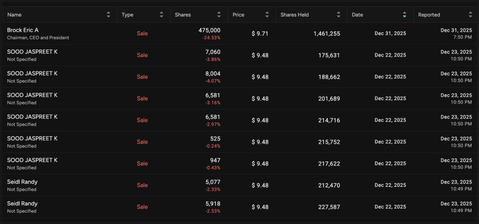 이런 상황에서 자연스럽게 따라오는 이슈가 바로 내부자 매도입니다. 최근 공시를 보면 CEO이자 회장인 에릭 브록(Eric A. Brock)을 포함해 다수의 임원과 관계자가 2025년 12월에 걸쳐 주식을 매도했습니다. 에릭 브록 CEO는 2025년 12월 31일에 47만 5천 주를 주당 약 9.71달러에 매도했고, 보유 주식의 약 24.5%에 해당합니다. 매도 금액은 약 460만 달러 수준이었고, 매도 이후에도 약 146만 주를 여전히 보유하고 있습니다.