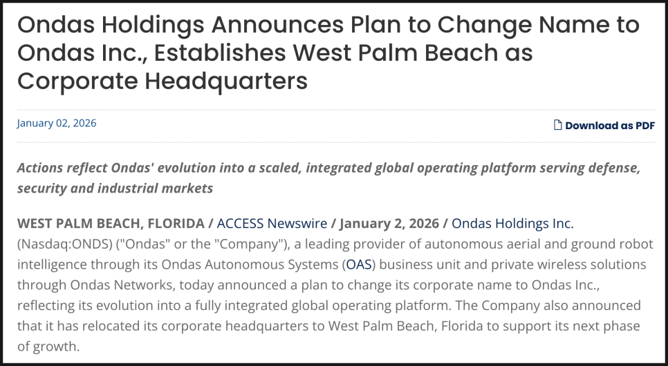 한편 이 회사는 최근 온다스 홀딩스에서 온다스(Ondas Inc)로 변경하겠다고 발표했습니다. 동시에 본사를 플로리다주 웨스트 팜비치로 이전하겠다는 계획도 함께 공개됐는데요. ‘홀딩스’라는 표현을 제거한 것은 자산을 묶어둔 지주회사보다는 실제 사업을 수행하는 운영 중심 기업이라는 이미지를 강화하려는 의도로 보입니다. 웨스트 팜비치는 방산 기업, 항공우주 업체, 정부 관련 네트워크와의 접근성이 높은 지역이기도 해서, 사업 확장을 염두에 둔 전략적 선택으로 해석됩니다.