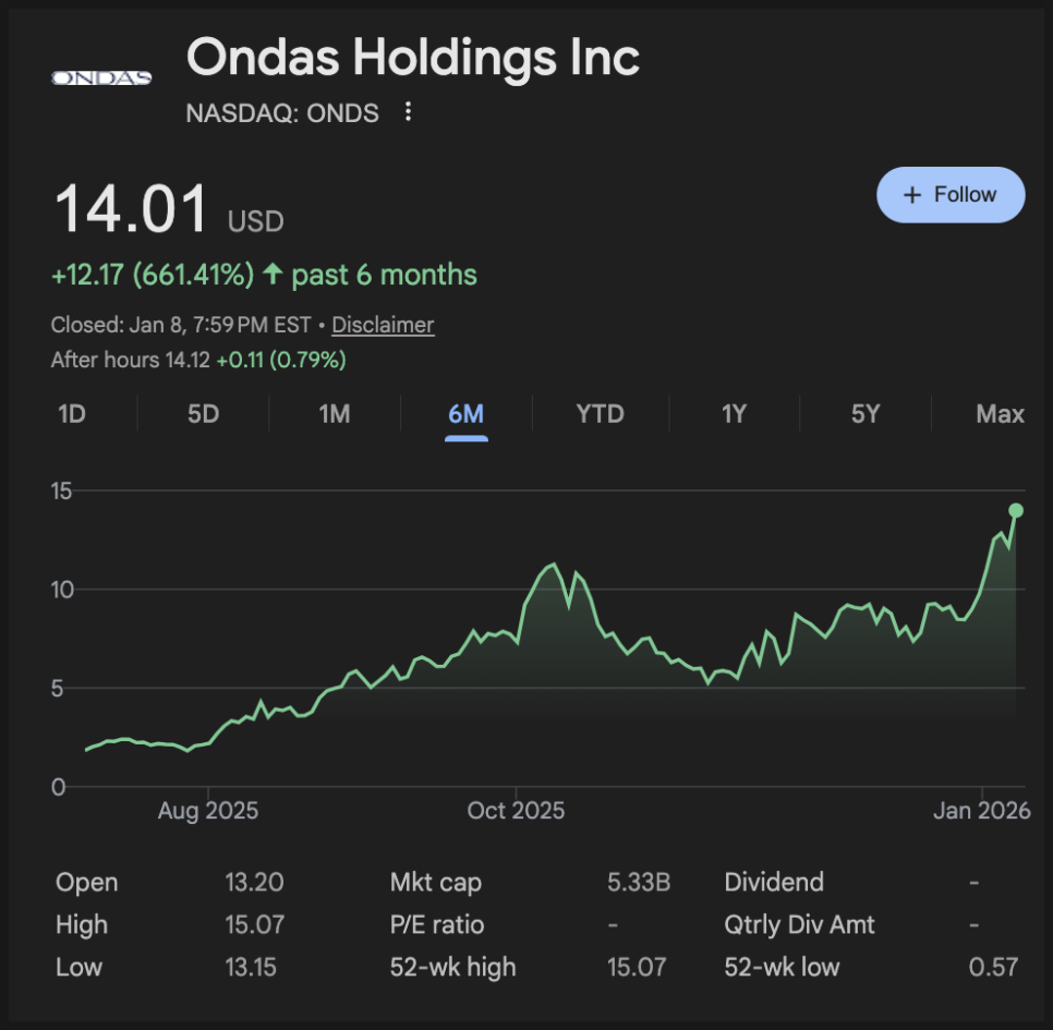 미국에서 자율 시스템과 방산의 중요성이 대두되면서 온다스 주가는 2025년 한 해 동안 약 500% 이상 상승했습니다. 연초만 해도 2달러 안팎에서 움직이던 주가는 2025년 하반기부터 가파르게 상승하기 시작했고, 2026년 1월 초 기준으로 14달러 선을 넘어섰습니다.