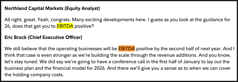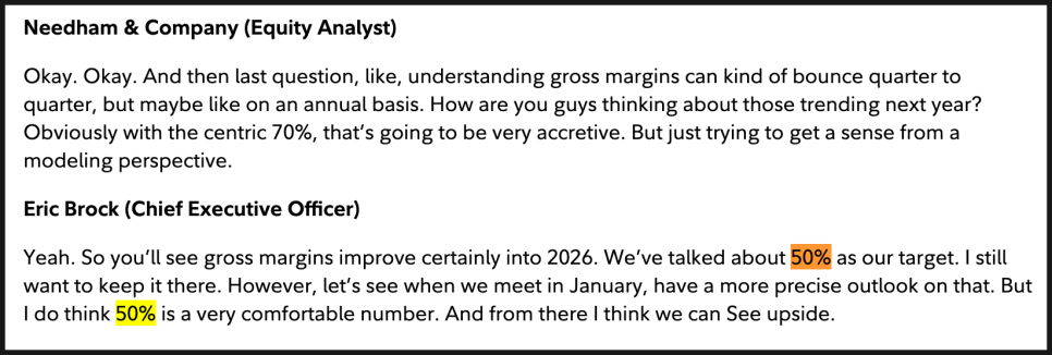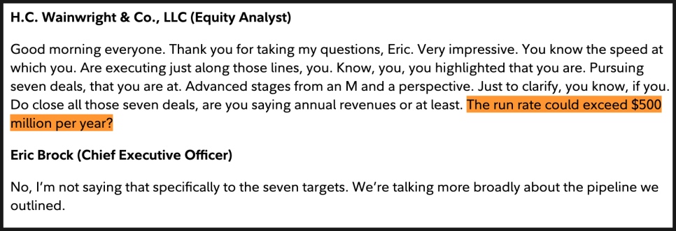 먼저 가장 많은 관심을 받은 부분은 M&A 파이프라인과 매출 잠재력이었습니다. 애널리스트가 “현재 진행 중인 7건의 인수를 모두 마무리하면 연 매출이 5억 달러 이상이 될 수 있느냐”고 묻자, CEO 에릭 브록은 명확히 선을 그었습니다. 지금 언급한 5억 달러 이상의 잠재 매출은 특정 7개 딜을 의미하는 것이 아니라, 전체 전략적 파이프라인을 넓게 본 수치라는 점을 분명히 했습니다. 중요한 포인트는 이 잠재력이 2026년 가이던스인 1억 1천만 달러 매출 전망에 추가적인 업사이드로 존재한다는 점입니다. 즉, 현재 가이던스 자체가 공격적인 M&A 확장을 전제로 한 숫자는 아니라는 의미죠.