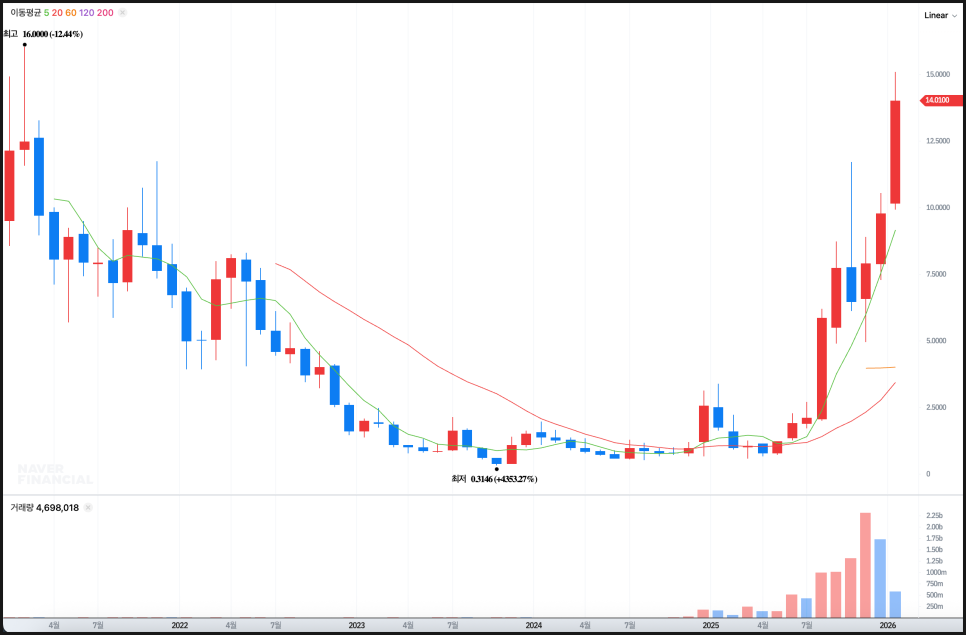 특히 중요한 건 상승 과정에서 5개월 선을 제대로 뚫고 내려간 적이 없다는 것인데요. 이제 남겨놓은 고점은 16 달러입니다. 2021년 3월에 약 16달러 부근에서 최고점을 찍은 뒤 긴 윗꼬리를 남긴 이력이 있기 때문에, 이 가격대는 과거 고점 매물과 심리적 부담이 동시에 존재하는 구간입니다. 상승 속도가 매우 가팔랐던 만큼, 월봉 관점에서는 이 고점대 근처에서 한두 달 정도의 조정이나 횡보가 나와도 전혀 이상하지 않은 위치이기도 합니다.