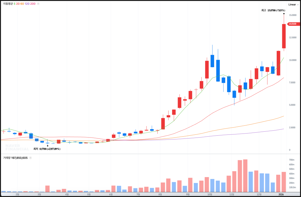주봉 차트입니다. 2025년 초만 해도 2~3달러대에서 움직이던 주가는 여름을 지나면서 본격적인 추세 상승 구간에 진입했고, 이후 고점과 저점이 계속 높아지는 전형적인 상승 추세를 만들어 왔습니다. 20주 이동평균선이 꾸준히 우상향하고 있고, 조정이 나와도 이 선들 근처에서 지지를 받는 모습이 반복됐습니다.