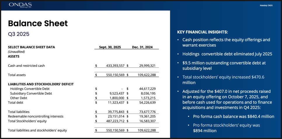 재무 구조에 대한 자신감도 강하게 드러났습니다. 온다스는 2025년에만 약 8억 5,500만 달러의 자금을 조달했고, 3분기 말 기준 현금 보유액은 4억 3,300만 달러에 달했습니다. 10월 초 추가 증자까지 반영하면, 사실상 업계 최상위 수준의 유동성을 확보한 상태입니다. 경영진은 이를 ‘낮은 자본 비용을 활용할 수 있는 구조적 경쟁력’으로 표현했는데요. 쉽게 말해, 좋은 기술이나 회사를 더 빠르고 공격적으로 인수하고 확장할 수 있는 체력이 있다는 뜻입니다.