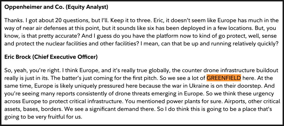 한편 유럽은 아직 본격적인 카운터 드론 인프라가 구축되지 않은 초기 단계, 이른바 ‘그린필드’ 시장이라는 점을 인정하면서도, 우크라이나 전쟁으로 인해 위협 인식이 매우 빠르게 높아지고 있다고 설명했습니다. 공항, 발전소, 군 기지, 국경 보호 등에서 긴급 수요가 발생하고 있고, 이는 온다스에게 매우 비옥한 시장이 될 수 있다는 평가였습니다.