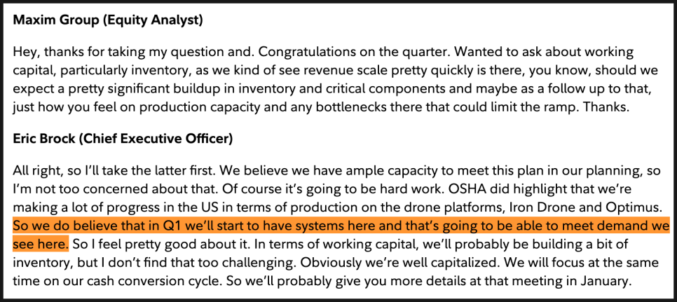 마지막으로 생산 능력과 재고에 대한 질문에 대해, 회사는 현재 계획된 성장 속도를 감당할 충분한 생산 역량을 갖추고 있다고 밝혔습니다. 2026년 1분기부터는 미국 내 생산 기반에서 아이언 드론과 옵티머스 시스템을 본격적으로 공급할 수 있을 것으로 보고 있습니다. 재고는 일부 늘어날 수 있지만, 충분한 현금 여력을 보유하고 있고 현금 회전 관리에 집중하겠다는 입장도 함께 나왔습니다.