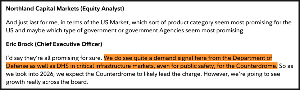 미국 시장에서 가장 유망한 제품과 고객군에 대해서는 2026년을 바라보면 카운터 드론이 가장 먼저 성장을 이끌 가능성이 높고, 국방부(DoD), 국토안보부(DHS), 그리고 핵심 인프라 및 공공 안전 영역에서 강한 수요 신호가 감지되고 있다고 밝혔습니다. 다만 특정 제품 하나에만 의존하지 않고 전반적인 포트폴리오 성장이 함께 나타날 것이라는 점도 덧붙였습니다.