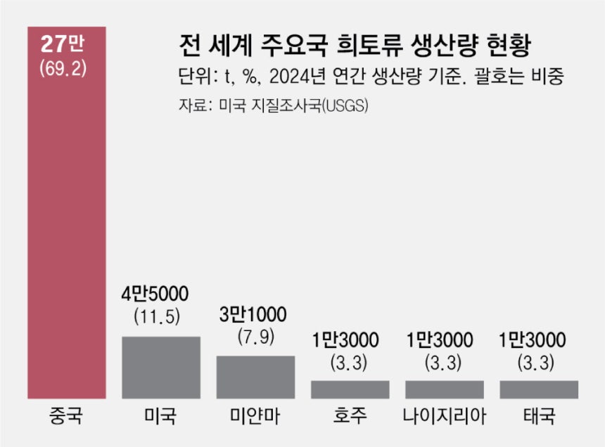 중국은 전 세계 희토류 채굴의 약 60%를 차지할 뿐만 아니라, 이를 분리하고 정제하는 제련 단계에서는 95% 이상의 독점적 지위를 누리고 있음