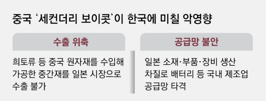 특히 중국이 일본으로 향하는 물량의 제3국 우회 수출까지 엄격히 통제하는 이른바 '세컨더리 보이콧' 방침을 시사함에 따라, 한국 기업들은 공급망 안정성과 대중 관계 사이에서 유례없는 전략적 선택을 강요받고 있음