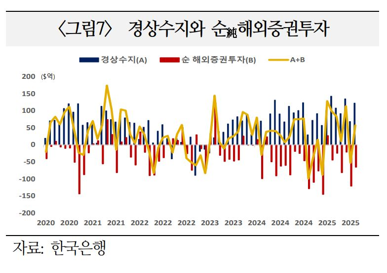 ㅇ `25.11월에는 경상수지 흑자를 통한 외화자금 유입 규모(+$122.4억)가 내ㆍ외국인 증권자금 순유출(-$65.2억)을 상회하면서 외환수급이 개선되었으며 최근까지도 이와 비슷한 양상이 이어지고 있는 것으로 추정