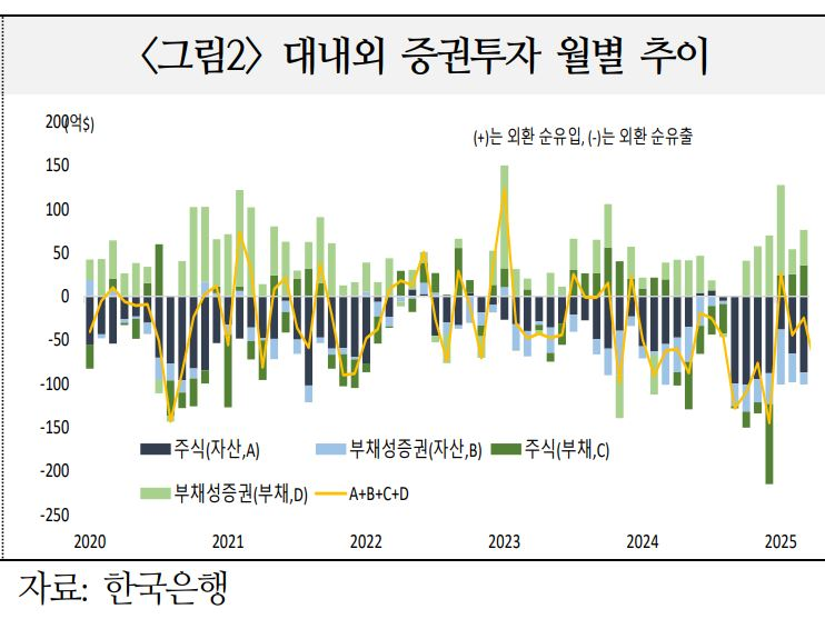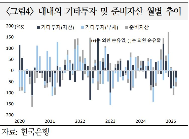 기타금융기관($65.6억 → $33.4억)을 중심으로 한 내국인의 해외 주식투자 둔화($180.4억 → $125.4억)와 외국인의 국내채권 순투자로 순유출 규모가 축소