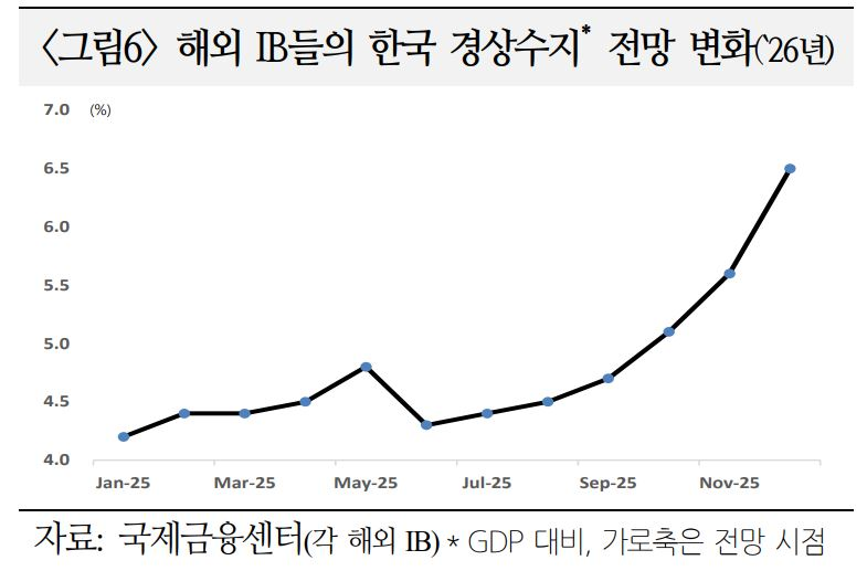 ㅇ 해외 IB들의 `26년 한국 경상수지 전망이 계속 개선되는 양상(`26년 전망치평균, 11월말 5.6% → 12월말 6.5%, GDP 대비)