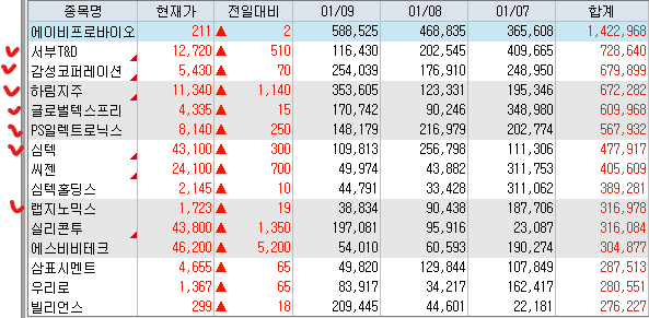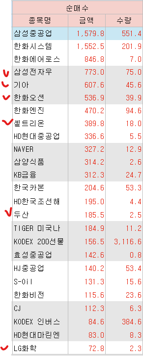 매도 : 한화 LG Tiger차이나휴머노이드로봇 삼성전자(+90.11%) LG이노텍 풀무원 한국카본 태광 기업은행 두산에너빌리티파라다이스 NAVER 유니셈 하나마이크론 이노와이어리스 세진중공업 휴림로봇(+62.01%) HJ중공업 SNT에너지 풍산 지엔씨에너지 KODEX레버리지 BNK금융 iM금융지주 실리콘투 퓨런티어 Tiger차이나전기차 KODEX200 코오롱티슈진
