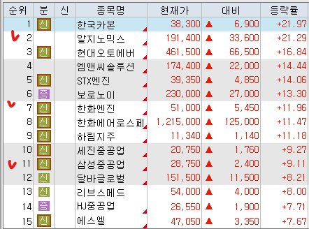 전 세계 군함 교체 수요가 1,000여척에 이를 것이라는 영국 국제전략연구소의 분석, 60조 캐나다 잠수함 수주 기대감 등에 조선주가 상승(한국카본 +21.97%, STX엔진 +14.06%, 한화엔진 +11.96%, 세진중공업 +9.27%, 동성화인텍 +9.26%, 삼성중공업 +9.11%, HJ중공업 +7.71%, HD한국조선해양 +5.18%, HD현대중공업 +4.47%)
