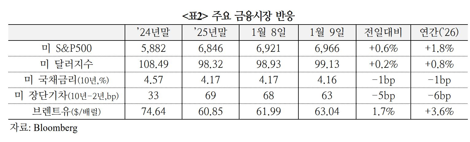 미국 주가는 12월 고용지표 결과로 노동시장 악화 우려가 해소되며 최고치 경신(S&P5006,966pt), 국채금리는 실업률 반락과 대법원 관세 판결 연기 등으로 상승