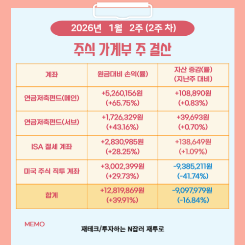 2026년 1월 2주 차 주식 가계부를 정리해 보았습니다. 이번 주는 ‘수익률의 변화’보다 ‘자산 흐름의 변화’가 더 크게 드러난 한 주였어서 계좌별로 어떤 일이 있었는지 차분하게 짚어보려고 합니다.