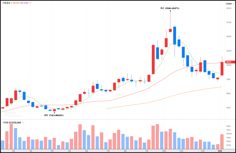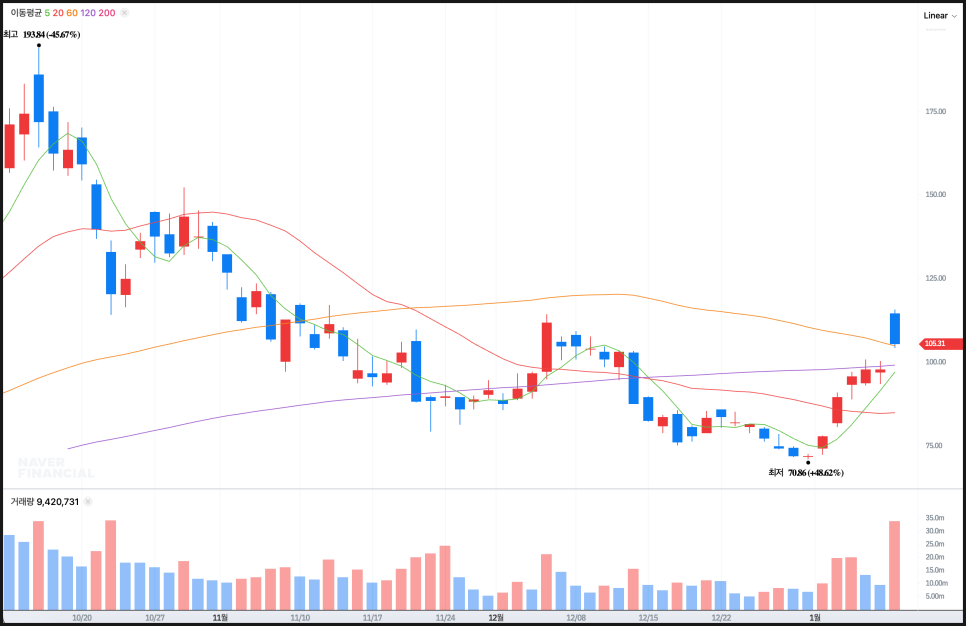 일봉에서는주가가 딱 60일 이동평균선에서 반응하고 있는데요. 단기 추세가 살아 있는지, 아니면 랠리 이후 조정 국면으로 넘어가는지를 가르는 기준선으로 자주 작동합니다. 여기서 지지를 확인하고 다시 거래량이 붙는다면, 이번 메타 이슈가 단발성 뉴스가 아니라 중기 추세로 이어질 여지도 생기겠죠.