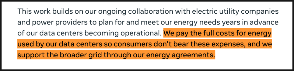 한편 메타가 이번 발표에서 강조한 것이 있는데 데이터센터에 쓰이는 전력 비용은 전부 메타가 부담하며, 일반 소비자에게 전가되지 않는다는 점입니다. 오히려 장기 계약을 통해 전력망 전체의 안정성을 높이고, 도매 전기 가격 변동성을 낮추는 데 도움이 된다는 논리죠.