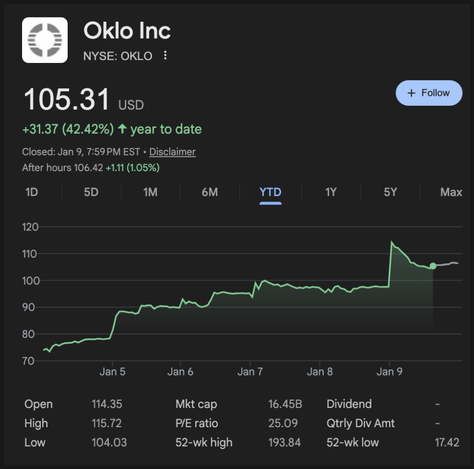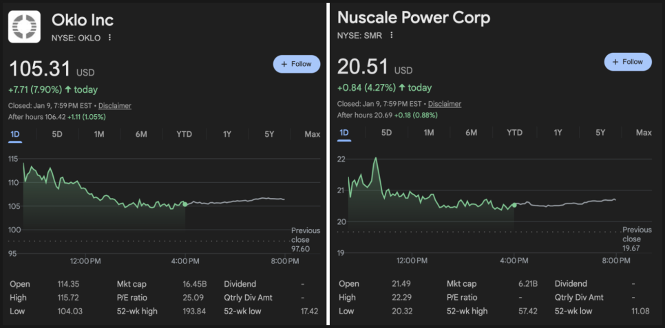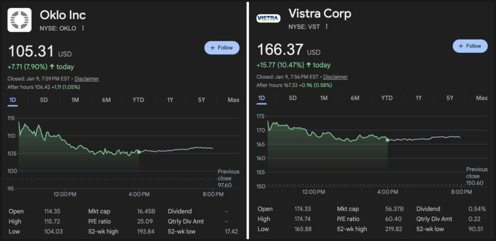 오클로 주가는 7.9% 상승했습니다. 개장 직후 최고 115 달러까지 올랐다가 105 달러 부근에서 마무리가 됐습니다. 비스트라(VST) 주가는 이날 10% 이상 급등했습니다.