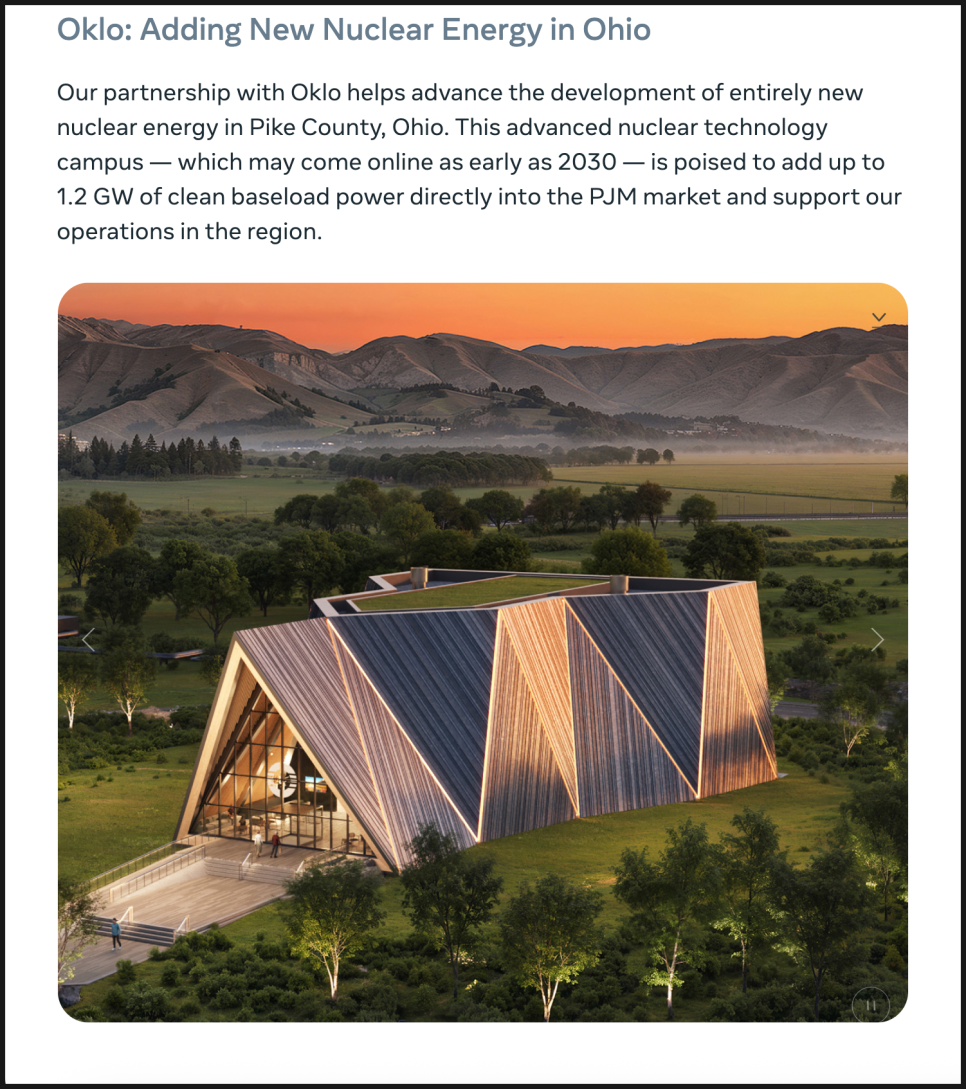 오클로와의 협력은 오하이오주 파이크 카운티에 완전히 새로운 원자력 캠퍼스를 짓는 내용입니다. 빠르면 2030년부터 가동이 가능하고, 최대 1.2기가와트의 전력을 PJM 전력 시장에 직접 공급하게 됩니다. 이 PJM은 미국 동부 최대 전력 시장인데요, 메타의 지역 데이터센터 운영과도 직결됩니다.