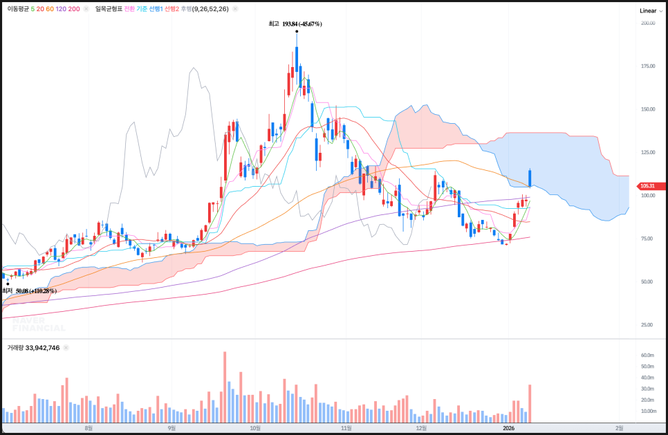 반대로 이 구간을 깔끔하게 지켜주지 못하면, 기대가 빠르게 식으면서 변동성이 커질 가능성도 열어둬야 합니다. 따라서 지금 차트는 방향이 이미 정해진 상태라기보다는, 시장이 한 번 더 지켜볼 자리로 보는 게 더 현실적일 것 같습니다. 일단은 구름대에 진입을 했다가 다시 입구컷을 당할 수도 있는 상황이라, 구름대를 넘겨줄 수 있는지를 먼저 봐야겠습니다.