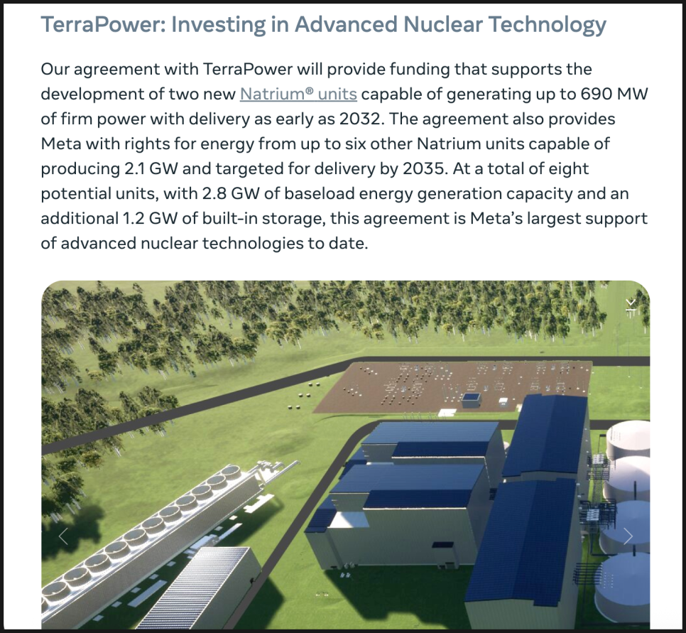 구체적으로 보면, 테라파워와의 계약은 차세대 원자로인 나트륨 원자로를 본격적으로 밀어주는 내용입니다. 우선 2032년까지 두 기를 건설해 약 690메가와트의 전력을 공급받고, 이후 최대 여섯 기를 추가해 총 2.8기가와트의 발전 용량과 1.2기가와트 규모의 전력 저장 능력까지 확보하는 구조입니다. 메타가 지금까지 지원한 차세대 원자력 프로젝트 중 가장 큰 규모입니다. 테라파워 입장에서는 메타라는 확실한 수요처를 확보하면서 자금 조달과 사업 추진이 훨씬 수월해졌죠.