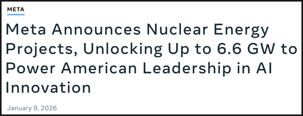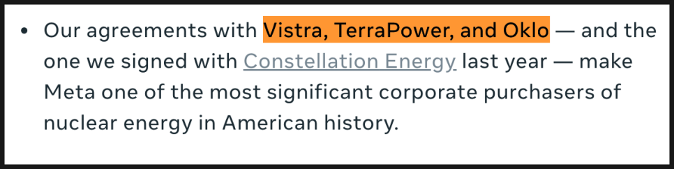 이번 계약의 상대는 비스트라, 테라파워, 오클로 세 곳이고, 작년에 계약했던 콘스텔레이션 에너지까지 합치면 메타는 미국 역사상 가장 큰 민간 원자력 전력 구매자 중 하나가 됩니다. 빅테크 기업이 원자력의 ‘최대 고객’으로 등장한 셈이죠.