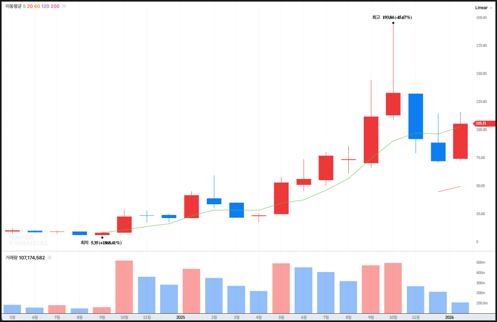 OKLO 차트를 보면 지금 위치가 꽤 흥미로운 구간이긴 합니다. 월봉 기준으로는 5개월 이동평균선 위에 정확히 걸려 있고,